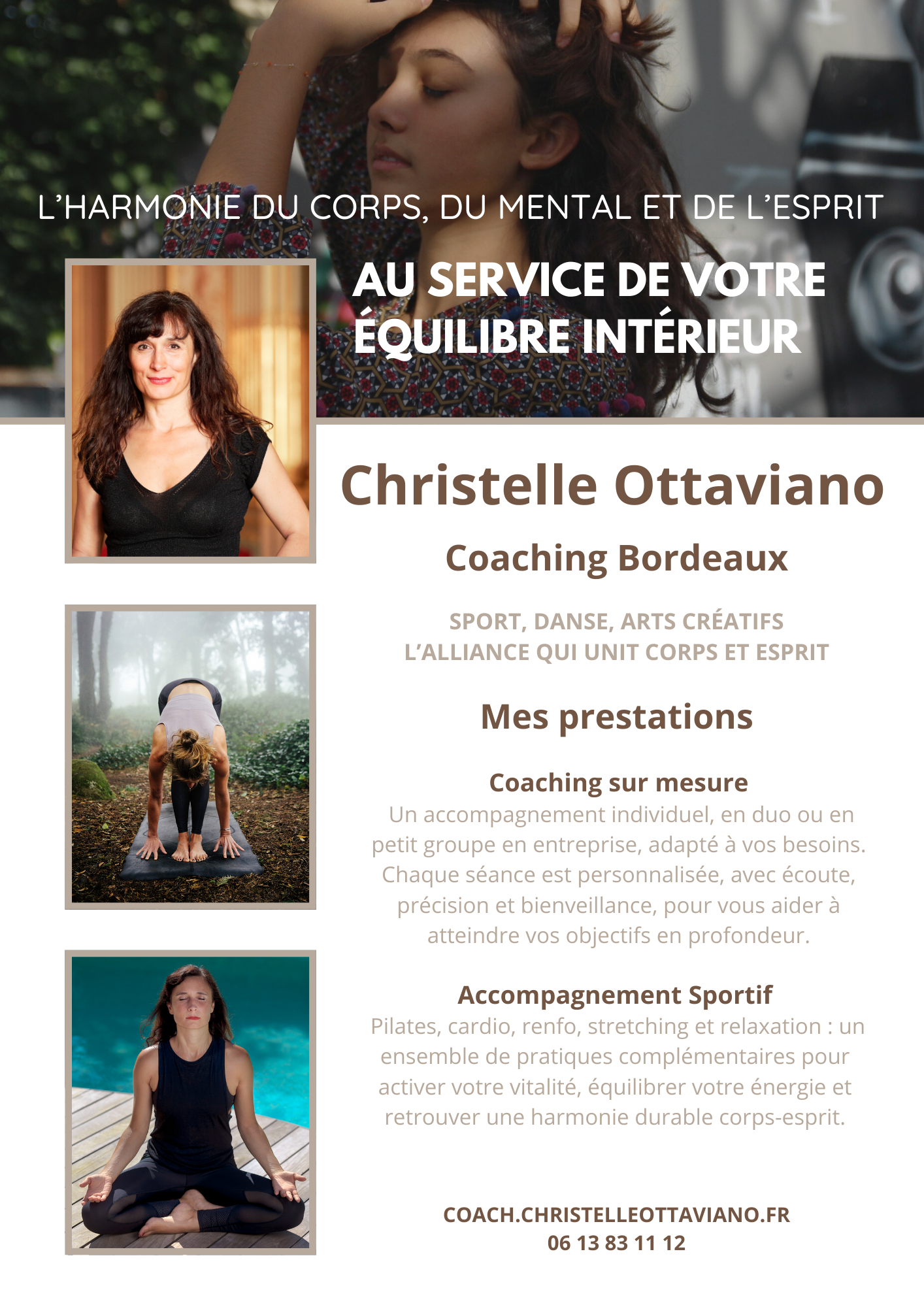 Christelle est coach sportive depuis plus de vingt cinq ans, diplômée de la Faculté de Bordeaux 2 et du CREPS. Son expérience confirmée devant des publics variés aux attentes diverses lui permet aujourd’hui de proposer des cours adaptés aux besoins spécifiques des établissements pour lesquels elle travaille, pour leur personnel.